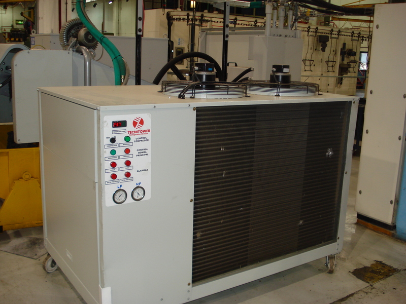 Básicamente el equipo cumple la función de una torre de enfriamiento de circuito cerrado. Las máquinas incluyen provistas por el fabricante un sistema de enfriamiento de aceite con condensacion por agua a través de un casco y tubo o una placa de acero inoxidable por donde circula agua glicolada que debe ser refrigerada. Para aquellos equipos que no incluyan el chiller de fábrica y necesiten mantener la temperatura del aceite bajo control podemos proveer chillers de condensación por aire como en este caso donde se enfría el aceite en forma directa.